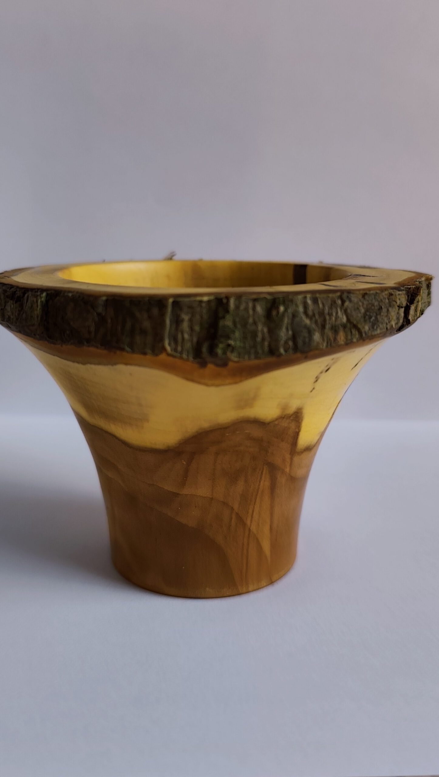Diese Schale ist eine handgedrechselte Naturrandschale, bei der die natürliche Form des gewachsenen Holzes bewusst erhalten geblieben ist. Der obere Rand zeigt noch die originale Baumrinde und bildet einen starken Kontrast zur ruhig gedrechselten Form.